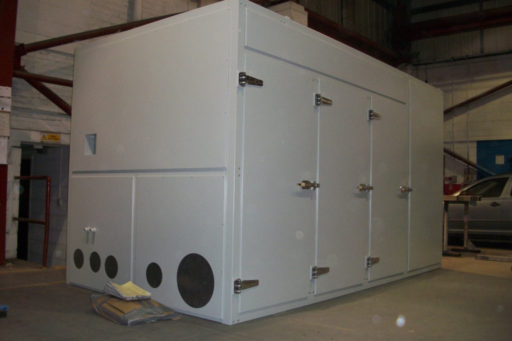 For general maintenance access, the enclosure was supplied with a pair of sliding acoustic doors to one end, along with hinged access panels to the side walls. Ventilation was provided via a plate-mounted axial fan and acoustically lined cowl on the side wall of the unit.
