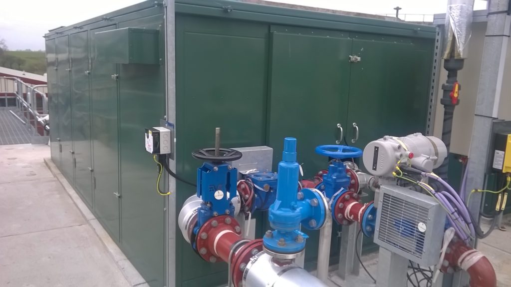 A sliding access door is incorporated at the end of the enclosure for access to pipework and valves. Additional means of access is also provided via hinged slide wall acoustic plant screens.